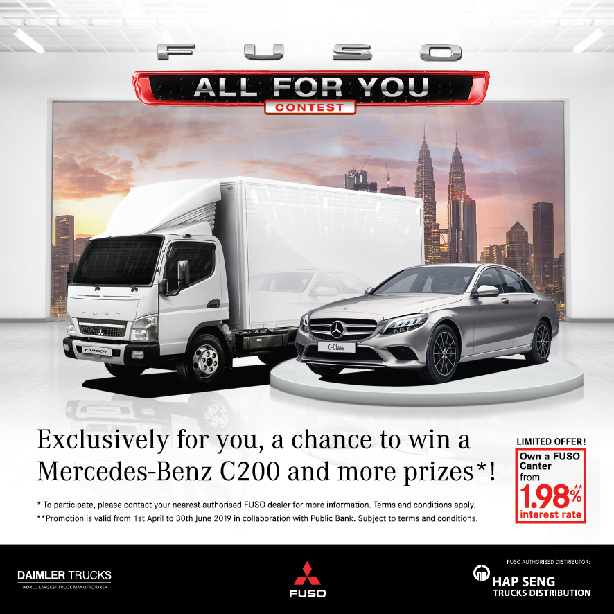 This contest is open to all MITSUBISHI FUSO trucks sold by Hap Seng Trucks Distribution Sdn. Bhd.’s authorized dealers, irrespective of models registered with JPJ from the 1st November 2018 to 31st December 2019. Participants will get a chance to win a Mercedes-Benz C200, Gold, Parts & service vouchers as well as Special Edition FUSO Touch ‘n Go card worth more than RM330,000*! There will be a Mini Draw and Grand Final Draw for this contest as below: