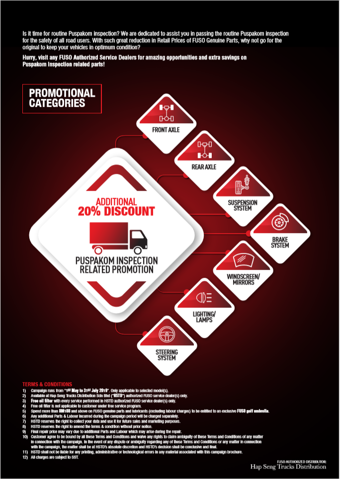 Is it that time again for your routine Puspakom Inspection? Most importantly from FUSO to our Value Customer is to ensure you not only pass the routine Puspakom Inspection but also safety of your’s and others road user. With such great Retail Price Reduction today, why not go for FUSO original parts in ensuring your vehicles in optimum condition? Hurry up, visit any of our FUSO Authorized Service Dealers for amazing opportunities and extra savings on Puspakom Inspection related parts right now!