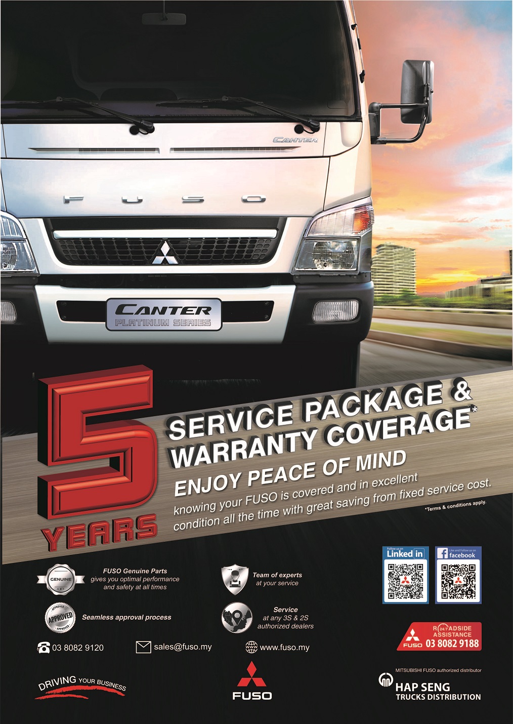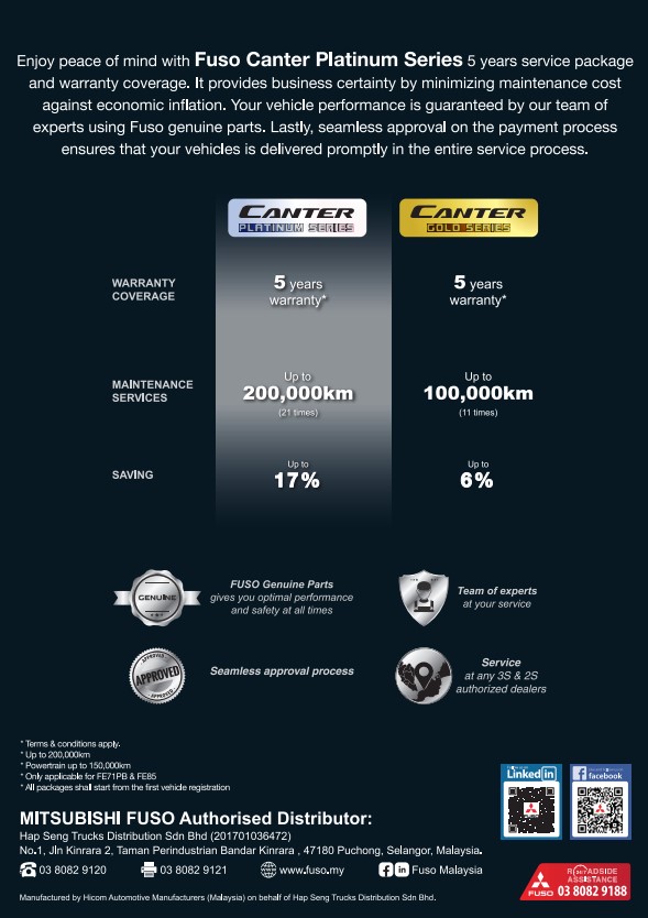 This package provides you with 5 years service package and warranty coverage that able to give you a peace of mind knowing that your FUSO is covered and will be in excellent condition all the time to run your business.